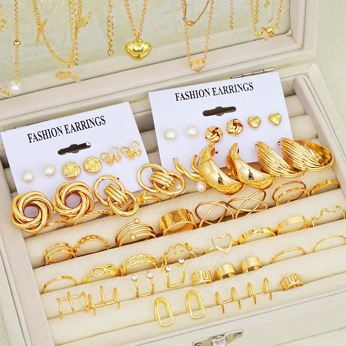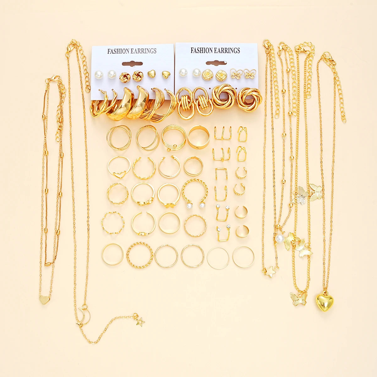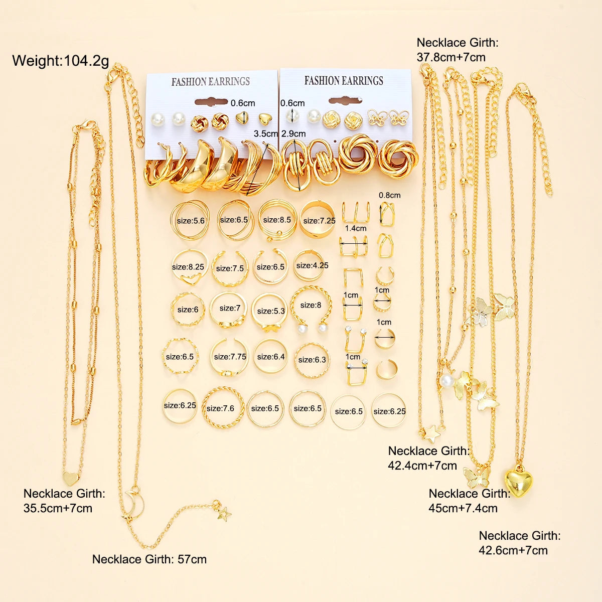 62-Piece Chic Jewelry Set for Women - Includes Earrings, Rings & Necklaces with Heart, Butterfly, Geometric Designs Jewelry Gift