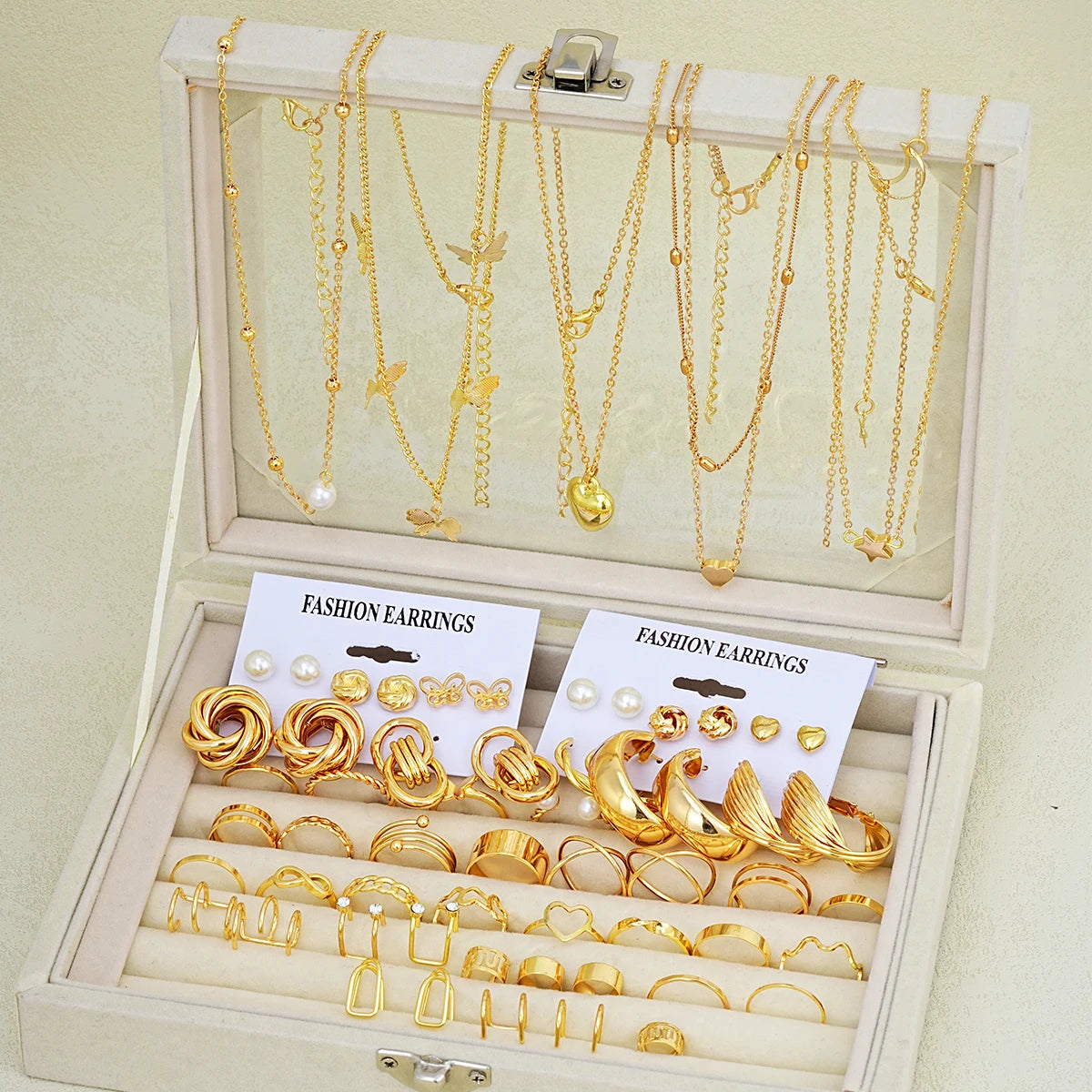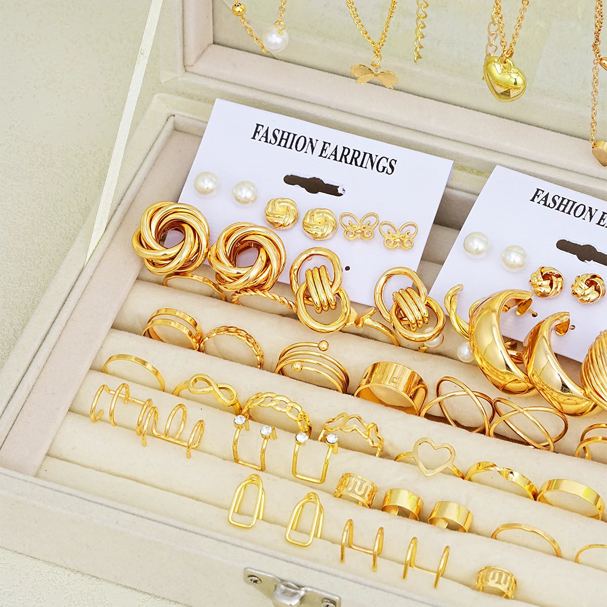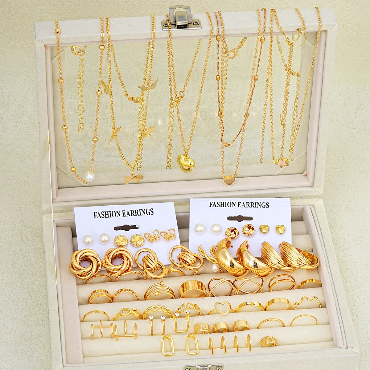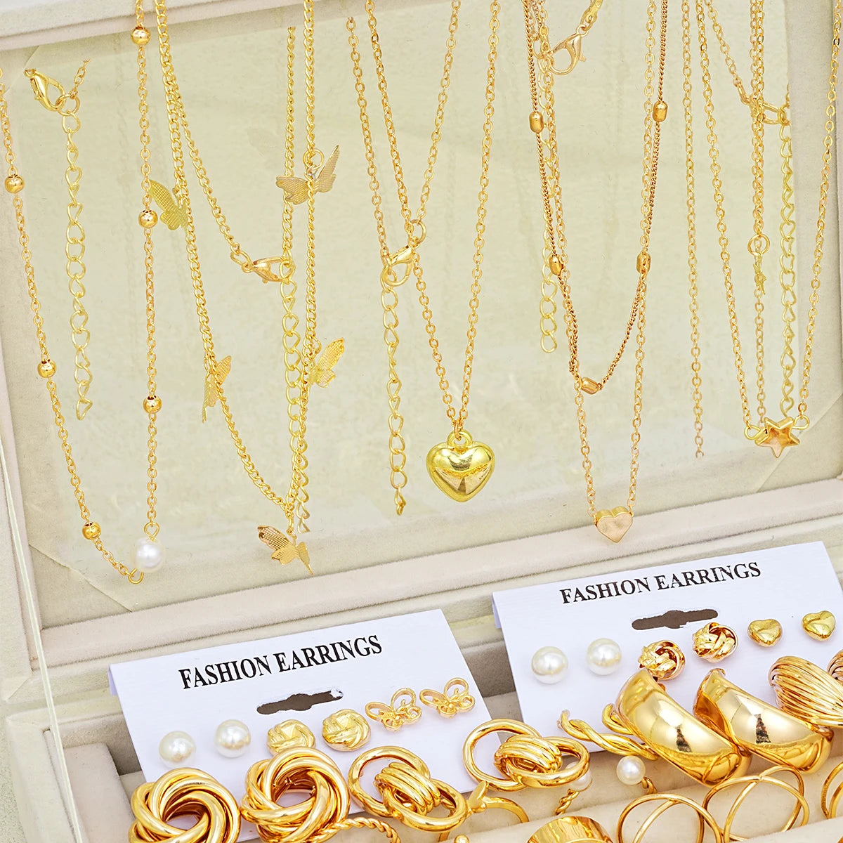 62-Piece Chic Jewelry Set for Women - Includes Earrings, Rings & Necklaces with Heart, Butterfly, Geometric Designs Jewelry Gift