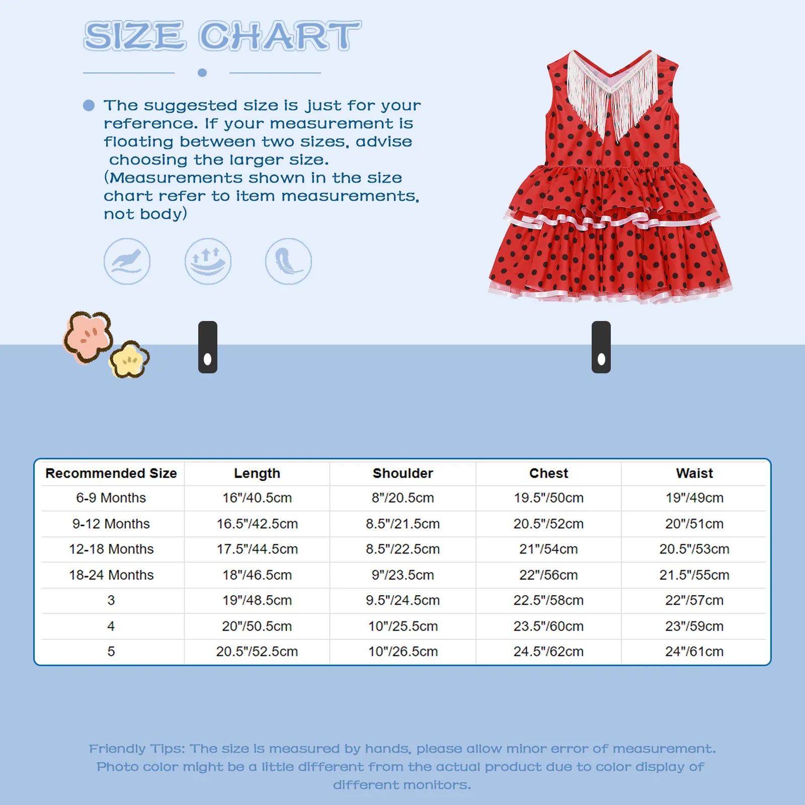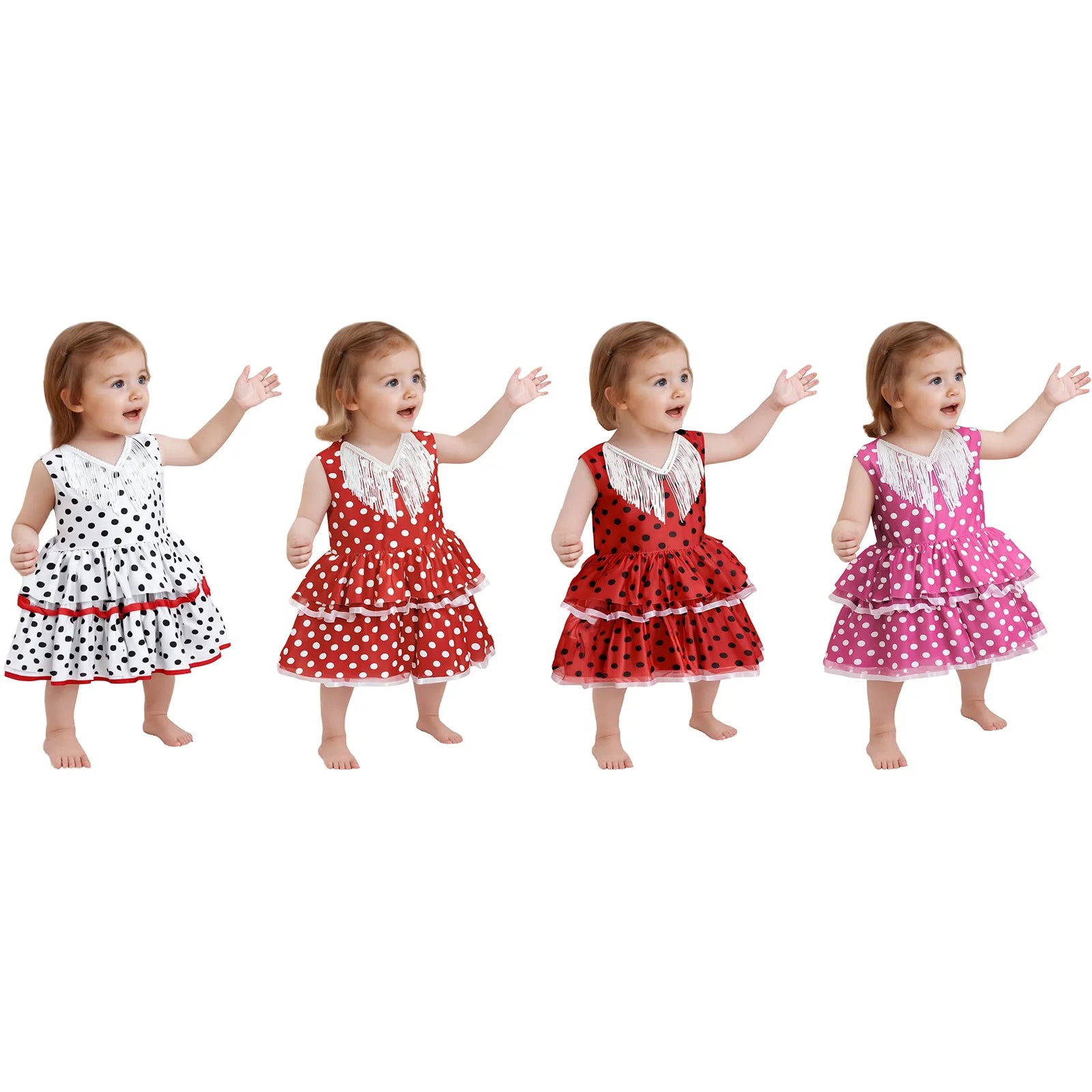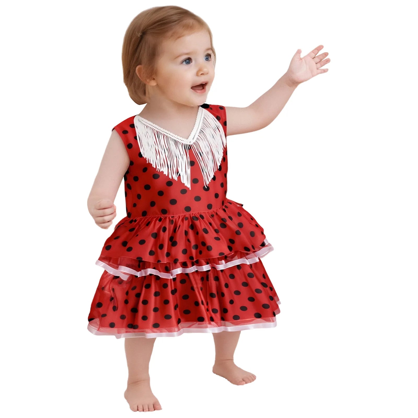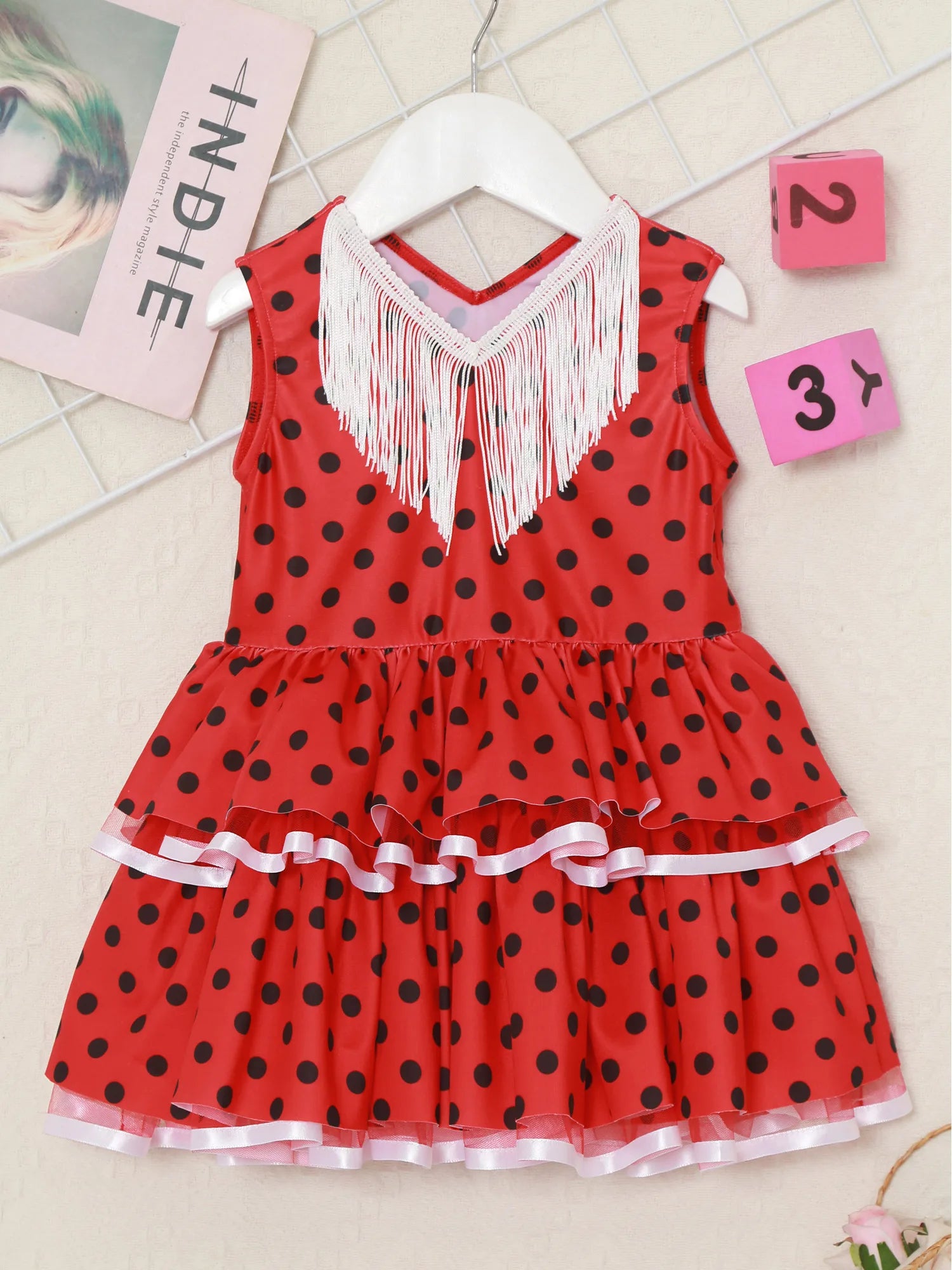 Baby Girls Cute Flamenco Dance Costume V-neck Sleeveless Tassel Polka Dot Mesh Layered Cake Dress for Dance Party Performance