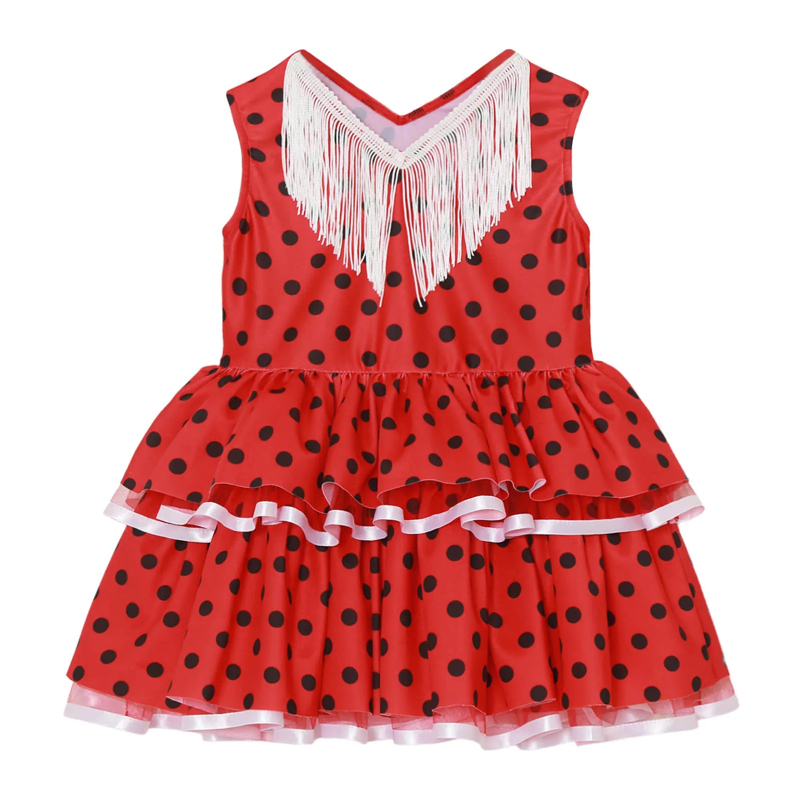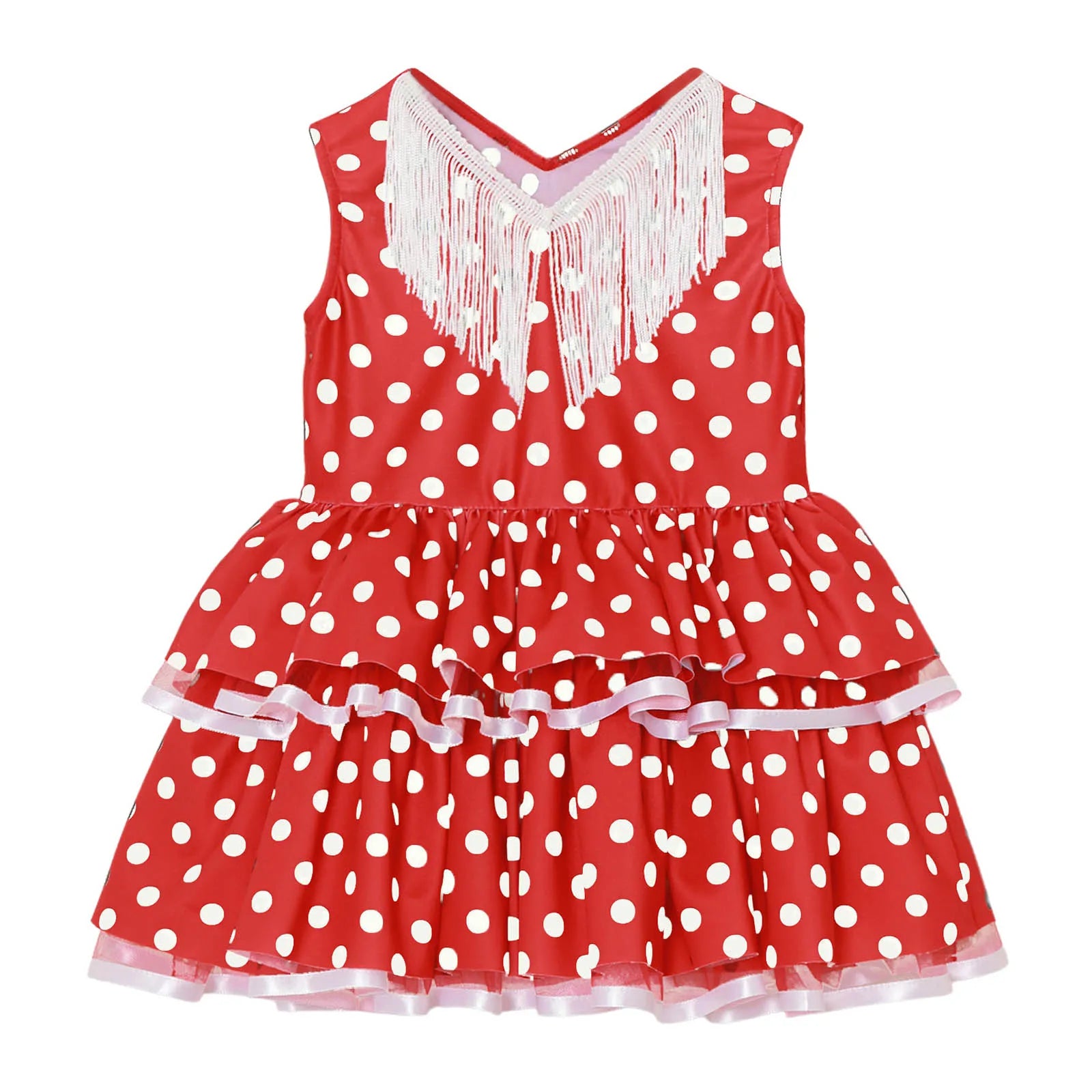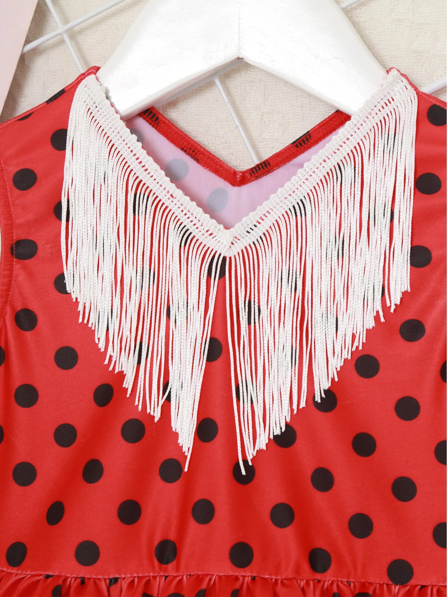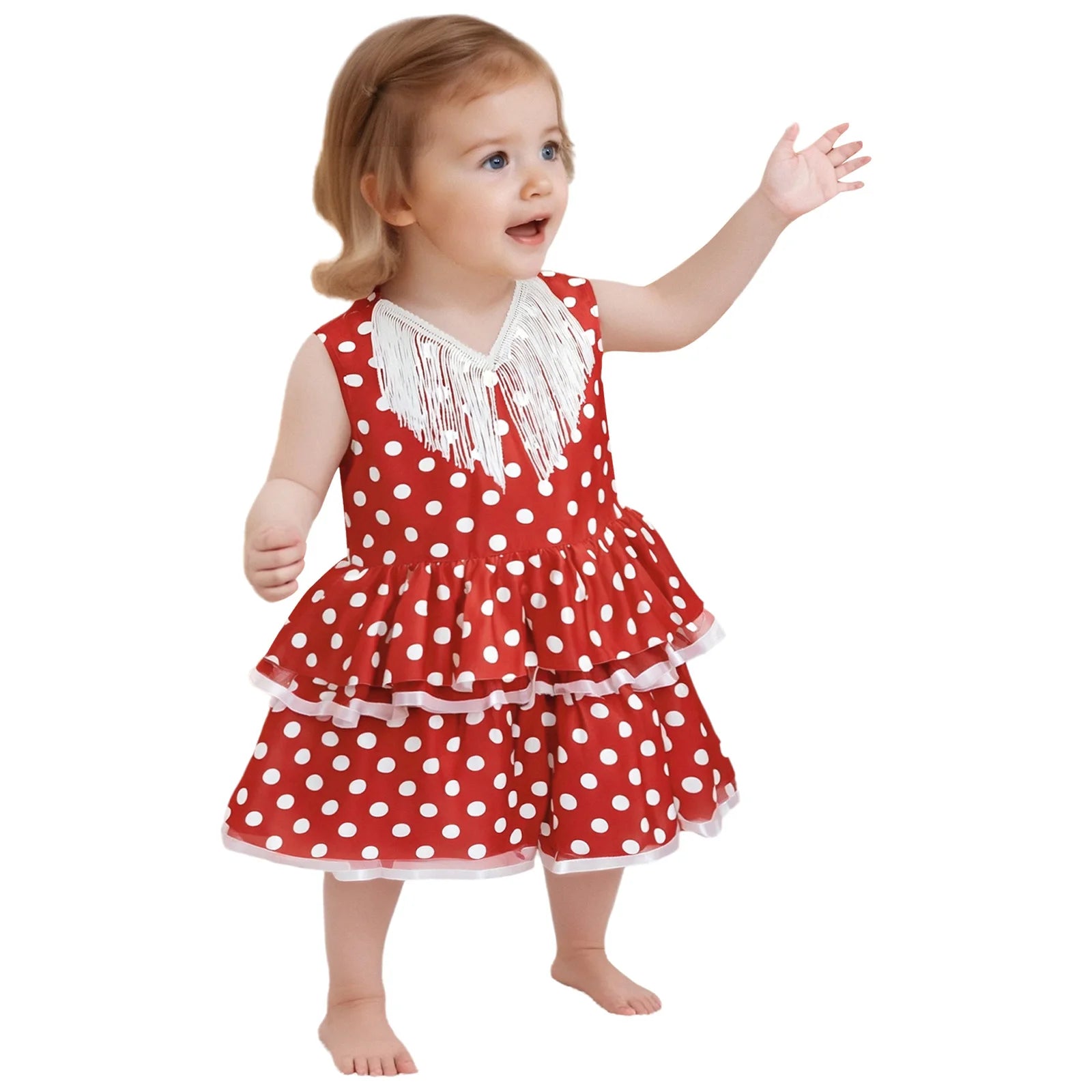 Baby Girls Cute Flamenco Dance Costume V-neck Sleeveless Tassel Polka Dot Mesh Layered Cake Dress for Dance Party Performance