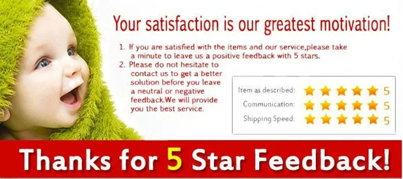 Your satisfaction and positive feedback is very important to us. Please leave positive feedback and 5 stars if you are satisfied with our items and services.