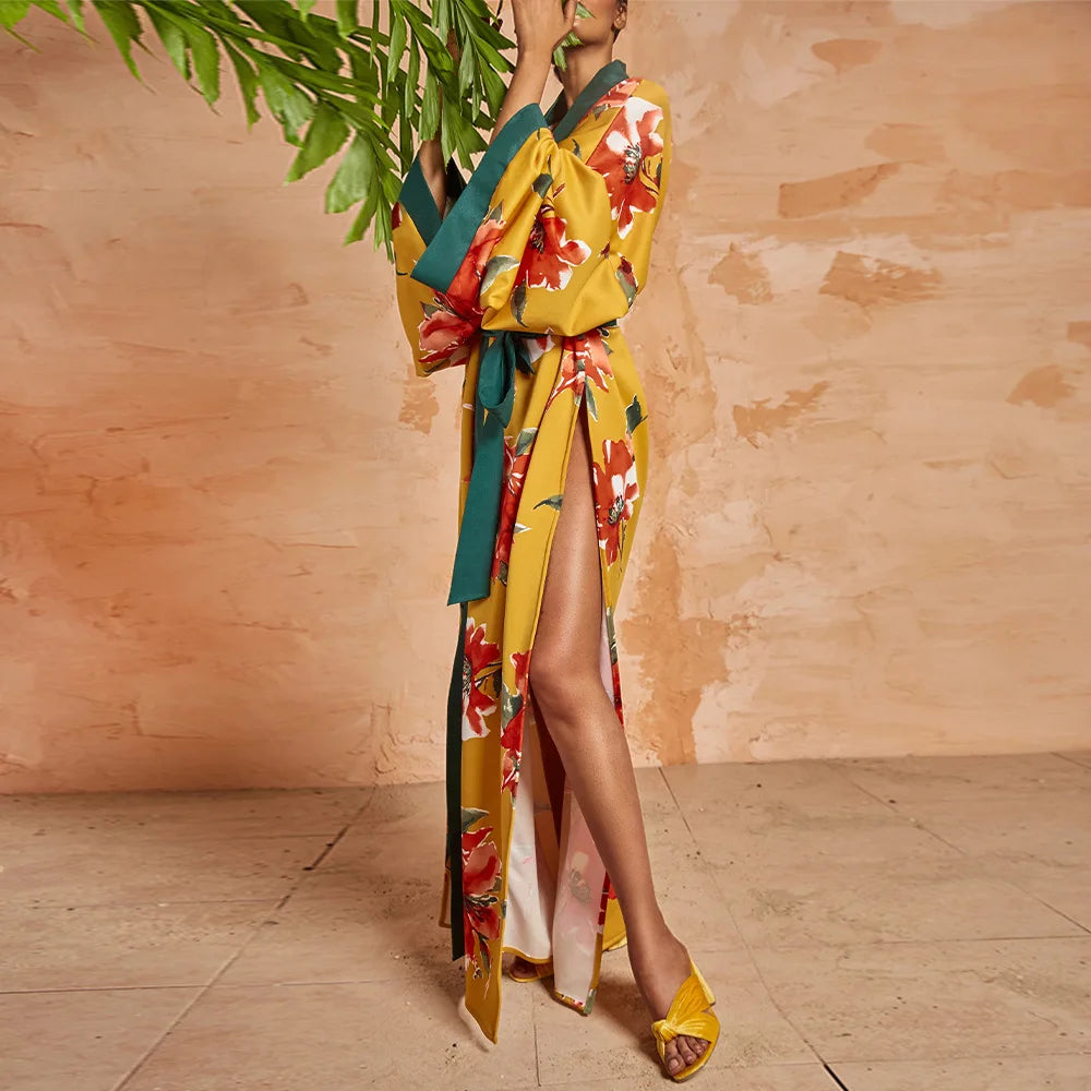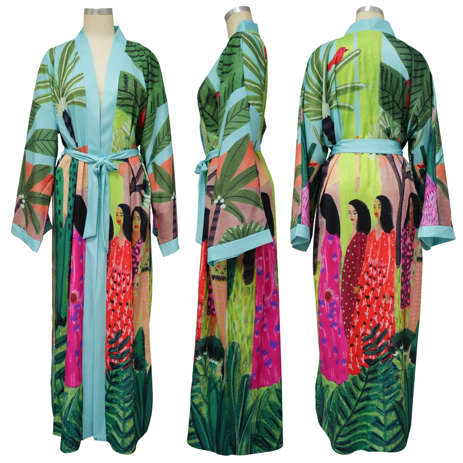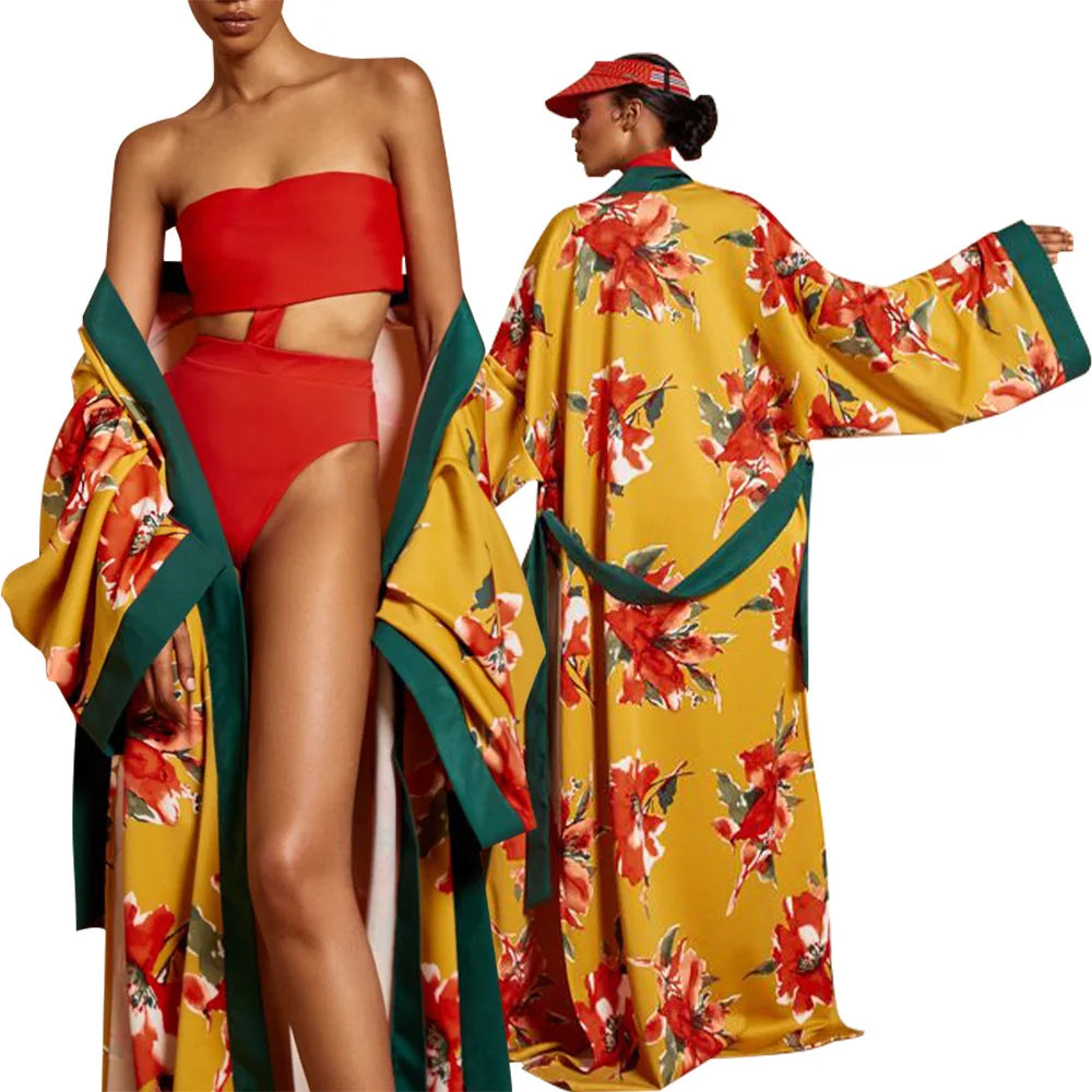 New Style Japanese Traditional Kimono Gown With Obi Popular Print Flower Pajamas Women Silk Large Size Bathrobe Yukata Dress